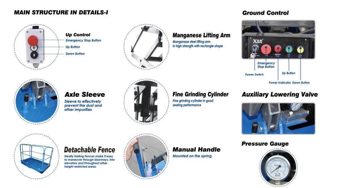 The scissor structure enables reliable stability when the lifts rising up, the broad platform and the high loading capacity get the aerial working more efficient and more safely.