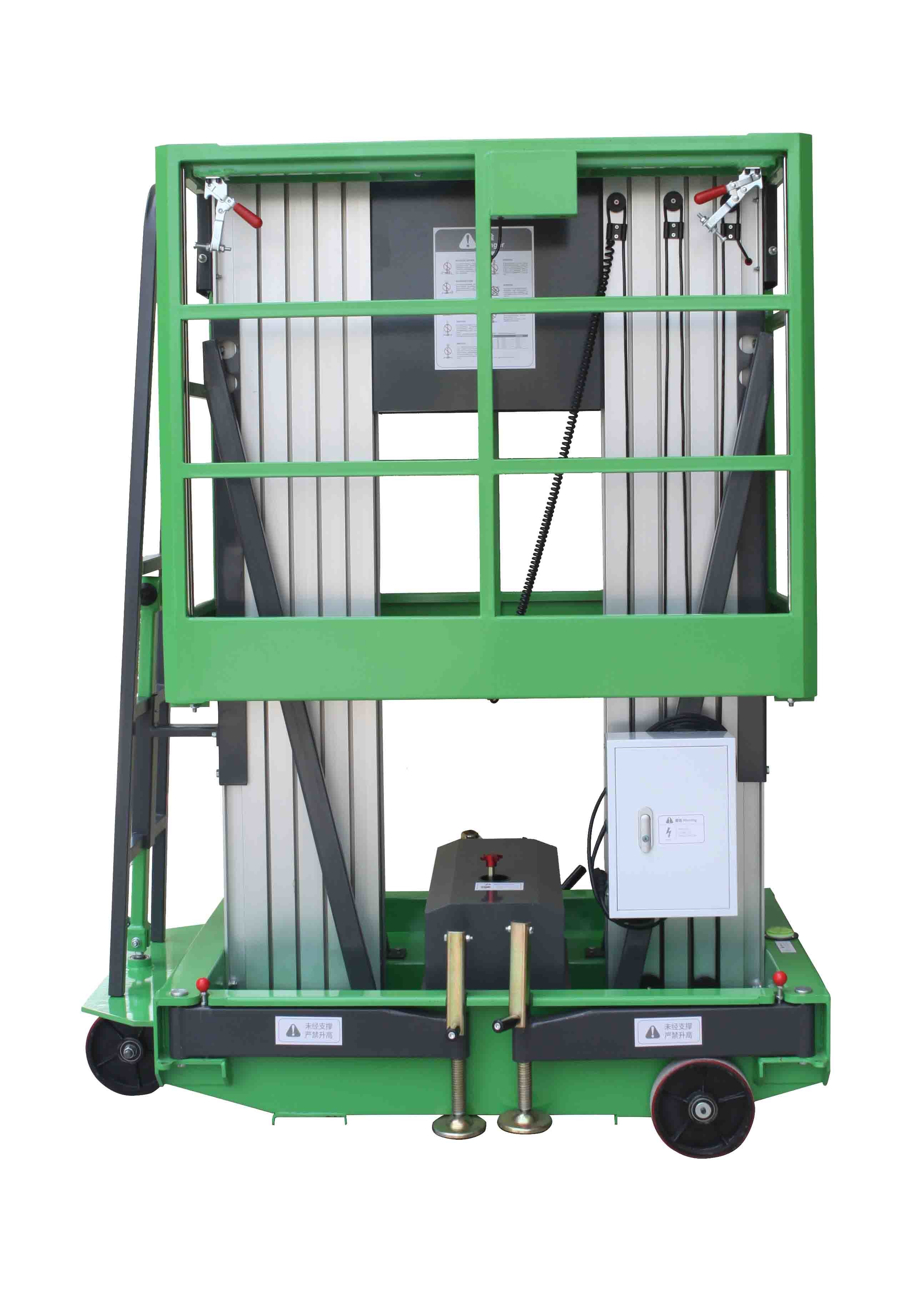 Mobile aluminum aerial work platform with motorized pulling device and extension platform, compared with mast aluminum AWP, it is equipped with the electric motorized device with moving and turning function. It is in manually traction; easily move, saving manpower and time. Driven by hydraulic motor, turning and lifting by battery in DC power, no external power required. It brings more efficiency and convenience as an ideal and most useful aerial working facility. The electric Self-propelled device can be configured in any of the lifts. And the extension platform can extend 0.8m on one side, there is no need for you to moveth machine to other place within 0.8m, Only double mast aerial work platform can equipped with extension platform.