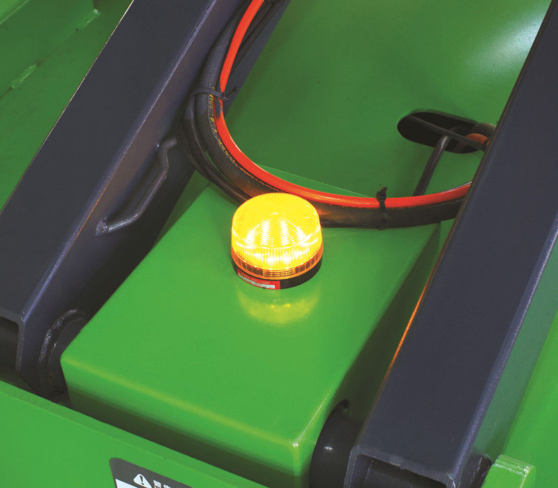 It can be controlled from either the ground or platform and has a battery charge indicator . It also has an emergency stop button, a descent alarm, an electronic horn, and a manual platform lowering valve for safety